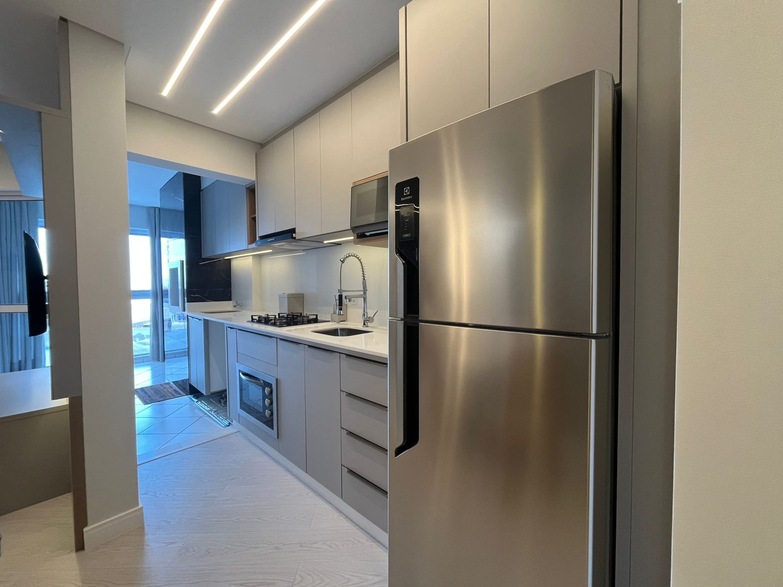 São 2 dormitórios (1 suíte), sala integrada à cozinha planejada, sacada com churrasqueira e vaga de garagem.